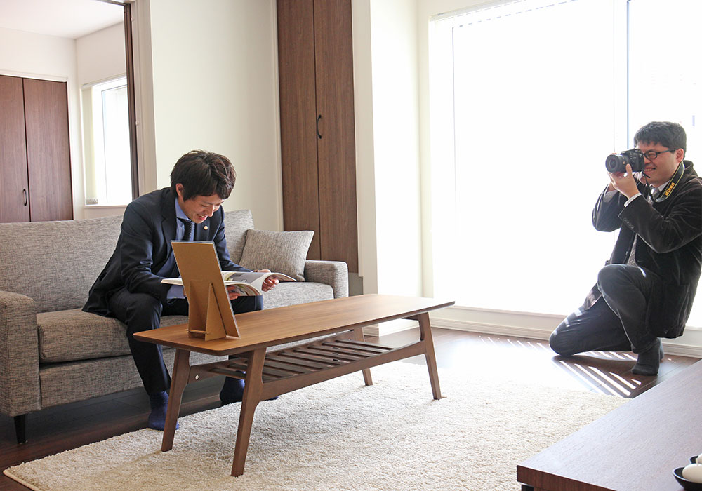 さて、今回はモデルの撮影だけじゃなく、『協栄ハウスのZEH』についてのインタビューがありました。質問攻めの刑にあったのは営業の板東氏。時折笑いも交えながら、ZEHモデルができた経緯などを語りました。