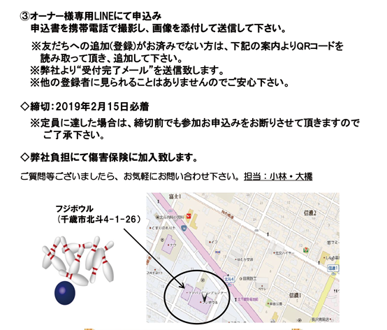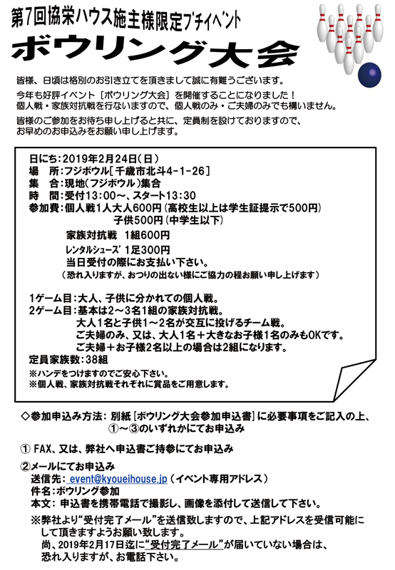 オーナー様対抗ボウリング大会…があります! 千歳・恵庭・札幌|モデルハウス・新築・戸建て・土地【協栄ハウス】 > 全件 > お知らせ > オーナー様対抗ボウリング大会…があります! 協栄ハウスではおなじみの、オーナー様限定イベント。 中でも一番の人気企画・ボウリング大会が今月開催されます! 個人戦(大人子供別)・家族対抗戦で分かれて盛り上がりますよ!(*’▽’)ノ オーナー様たちにはDMなどでお知らせしておりますが、無くした方もいらっしゃるかもなので、 一応こちらにも要項を載せておきますね。 申し込み受け付けは2/15までです! よろしくお願いいたします(*‘∀‘) « 前のページ 一覧に戻る 次のページ » アーカイブ 年を選択 2025 (11) 2024 (81) 2023 (87) 2022 (119) 2021 (165) 2020 (154) 2019 (166) 2018 (246) 2017 (206) 2016 (47) 2015 (23) 2014 (5) カテゴリー カテゴリを選択 全件 お知らせ イベント その他