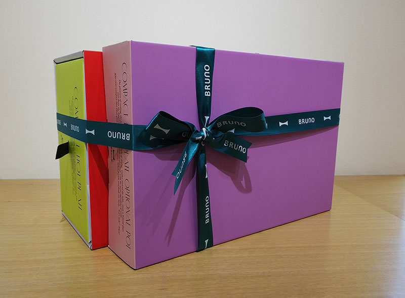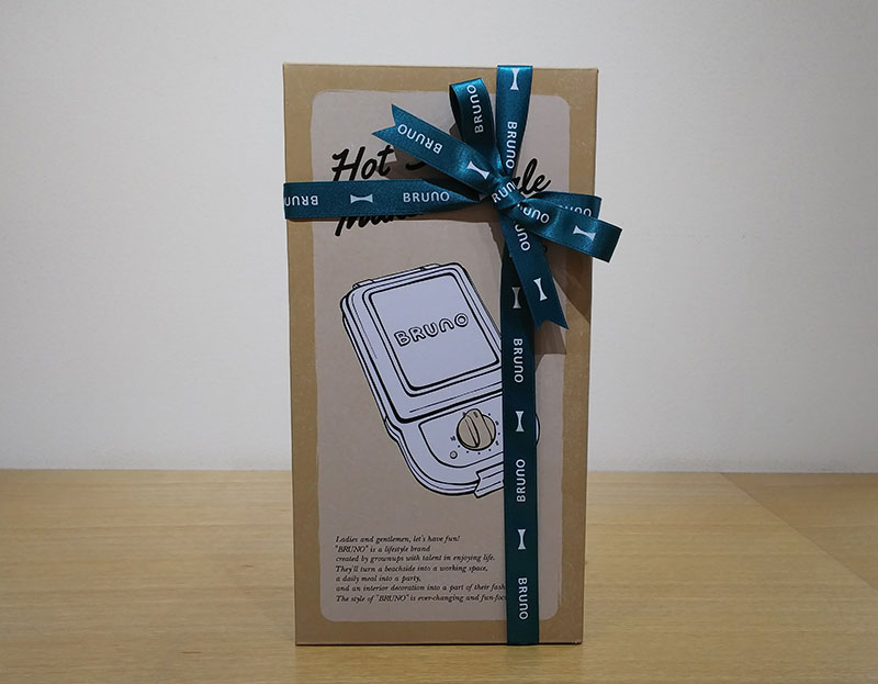 コンパクトホットプレートとセラミックコート鍋のセットなので箱が2つです。ブルーノさんのラッピングはリボンかけるだけらしいのでこんな感じ。お渡しするとき抜けないように気をつけなきゃですね!