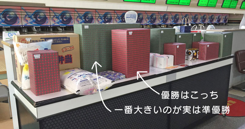 例えば上記のマイボウルやマイシューズ持参の方は、マイナス20点のハンデ等…。ハンデパターンを考えるのが大変だったようです。おかげで大混戦になり、面白い大会になったんですけどね(^^)