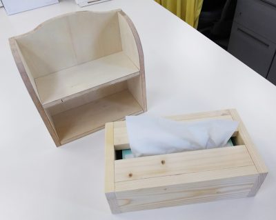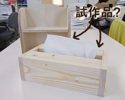 さて、今日は藤枝雑貨店からこっそりなんか見つけてきました。(※藤枝雑貨店とは…毎年感謝祭が近づくと、協栄ハウスのアフター担当・藤枝氏が子供日曜大工で作るものを何にしようかと試作品を色々作っては社内の一角に溜めるのです。そこが藤枝雑貨店。)これは、飾り棚?とティッシュBOX???