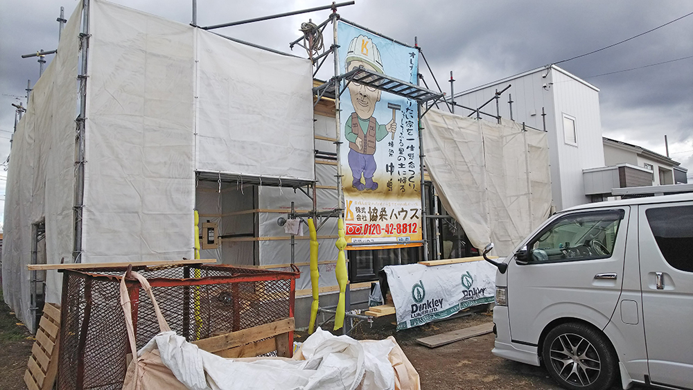 外壁貼られてないけど玄関はなんとなくわかりますね。ポストあるし。