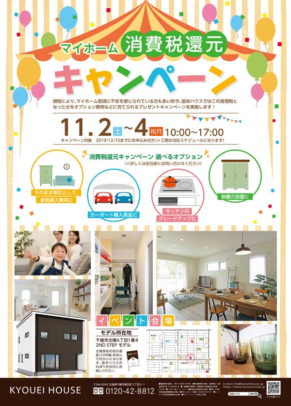 消費税さえ上がらなければその分であれこれできたのに…。予算削らなきゃいけないの?となっている増税前の駆け込みに間に合わなかった方…はもちろん、消費税関係なくそろそろ建てようと思っているというお客様まで。2%ぶんを協栄ハウスがお世話します!千歳のモデルハウス、北陽2NDSTEPでご相談を承りますので、この連休はモデルハウスまで(^^)/