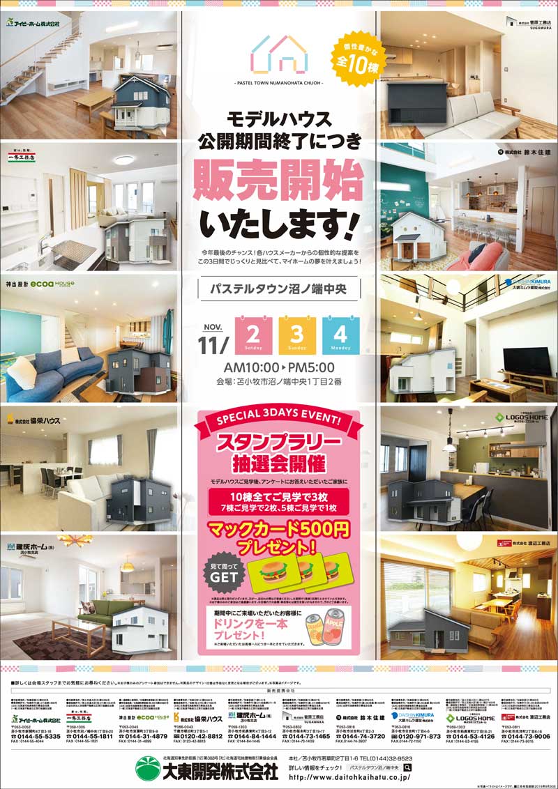 今週はもう一件イベントがあります。苫小牧のパステルタウン沼ノ端中央!もうこちらでも何度もお知らせしているのでご存知かもしれませんが…沼の端で行う10社合同イベントです。新聞に折り込まれる大きなチラシとスタンプラリーで有名ですね。土地も販売済みが増えてきたため、全社モデルハウス販売に力を入れています。協栄のモデルも販売中ですのでよろしくお願いいたします!
