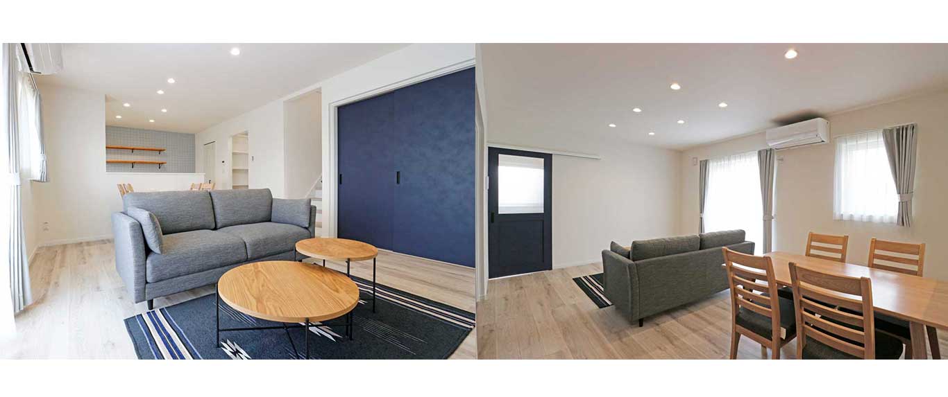 LDKは隣に一部屋ありますが、扉で隠すとこんな感じですね。(扉が開いてる写真はモデル紹介ページの方に掲載しています)右の写真はキッチンの隣から写しています。これでLDKの大きさが16帖です。隣も開けたら合わせて20.5帖。1FにこれくらいのLDKと、もう一部屋欲しいというリクエストがとても多いためこのようになりました。