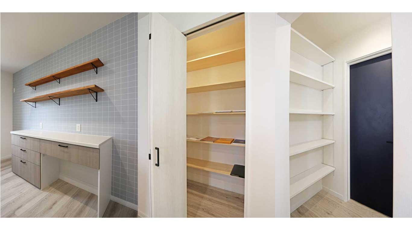 左からキッチン背面収納とパントリー、洗面室です。角度の違う写真はモデル紹介ページの方にありますので、ここではピンポイントでご紹介。綺麗な新築の家に引っ越して一か月も経つと…買い置きの食材やらラップなどの日用品が出てきてキッチン収納を圧迫していきます。そんな時パントリーがあると本当に便利ですよ。洗面室の棚もタオル置き場に必須です。