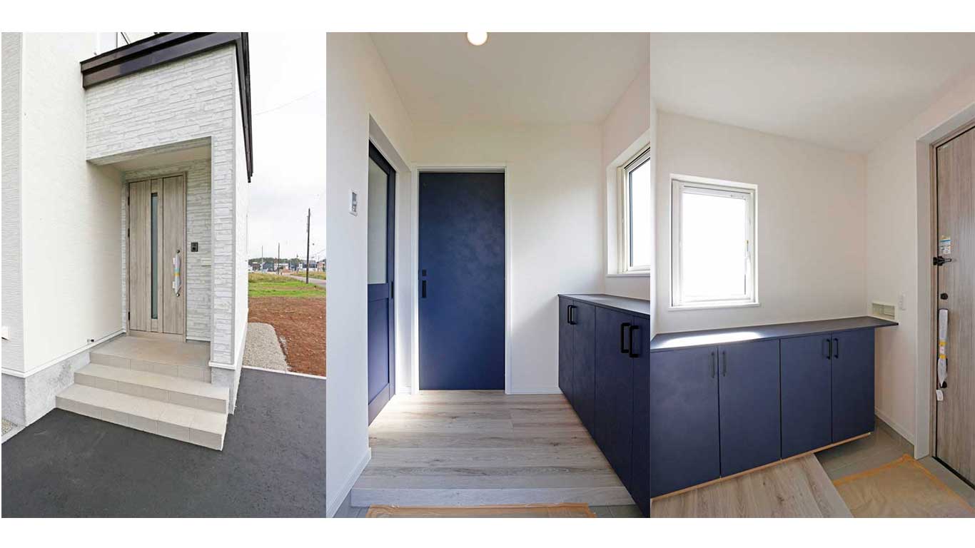 玄関開けたらとてもネイビーです!右の写真のシューズボックス。天板がポストまで伸びているので、郵便物が下に落ちて濡れてしまうのを防げますね。つづいてリビングです。