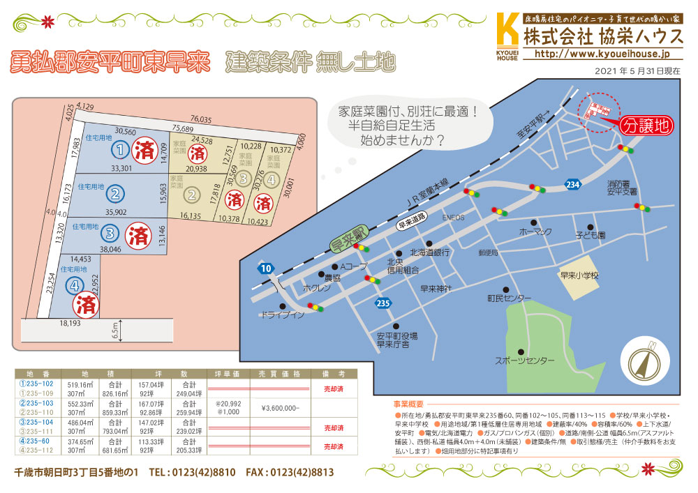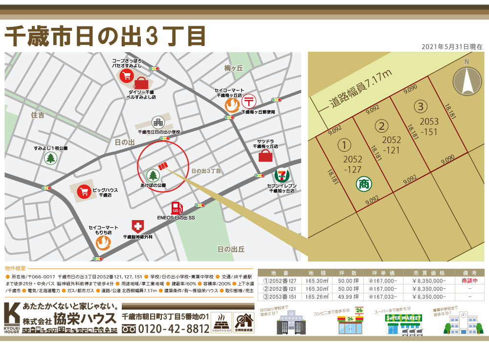 土地の再掲載と建築条件について 千歳・恵庭・札幌|モデルハウス・新築・戸建て・土地【協栄ハウス】 > 全件 > お知らせ > 土地の再掲載と建築条件について 試掘調査の為、掲載を一時停止しておりました日の出3丁目の土地ですが、この度調査が終了いたしましたので再掲載させていただきます。 また、本日より【安平町早来】と【苫小牧市永福1丁目】の土地の建築条件が【無し】になりました。 土地だけ欲しい、建てたい会社がすでに決まっている、そんな場合もお気軽にご相談ください。 « 前のページ 一覧に戻る 次のページ » アーカイブ 年を選択 2025 (11) 2024 (81) 2023 (87) 2022 (119) 2021 (165) 2020 (154) 2019 (166) 2018 (246) 2017 (206) 2016 (47) 2015 (23) 2014 (5) カテゴリー カテゴリを選択 全件 お知らせ イベント その他