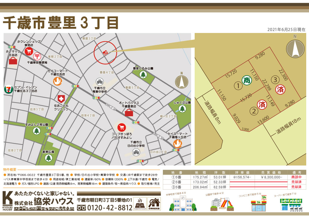 ただ、商談中マークを付けた時点ではまだ、先のことはわかりません。商談中のお客様が①の場合はほぼ、商談マークが外れることなくそのまま済マークに変わりますが、②や③の場合はマークが外れることも多々あります。もし、気になっている土地に商談マークがついていても、まずはお問い合わせ下さい。その際は状況が変わったら優先的にご連絡させていただきます。