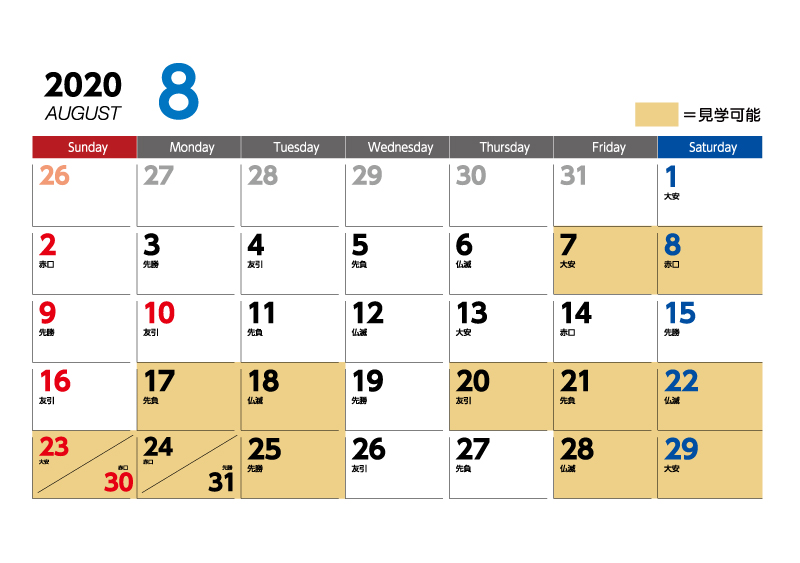 ①日時:見学可能な日はこちらのカレンダーの色がついている日となります。(通常のモデル同様10:00~17:00の間でご希望をお伝え下さい)