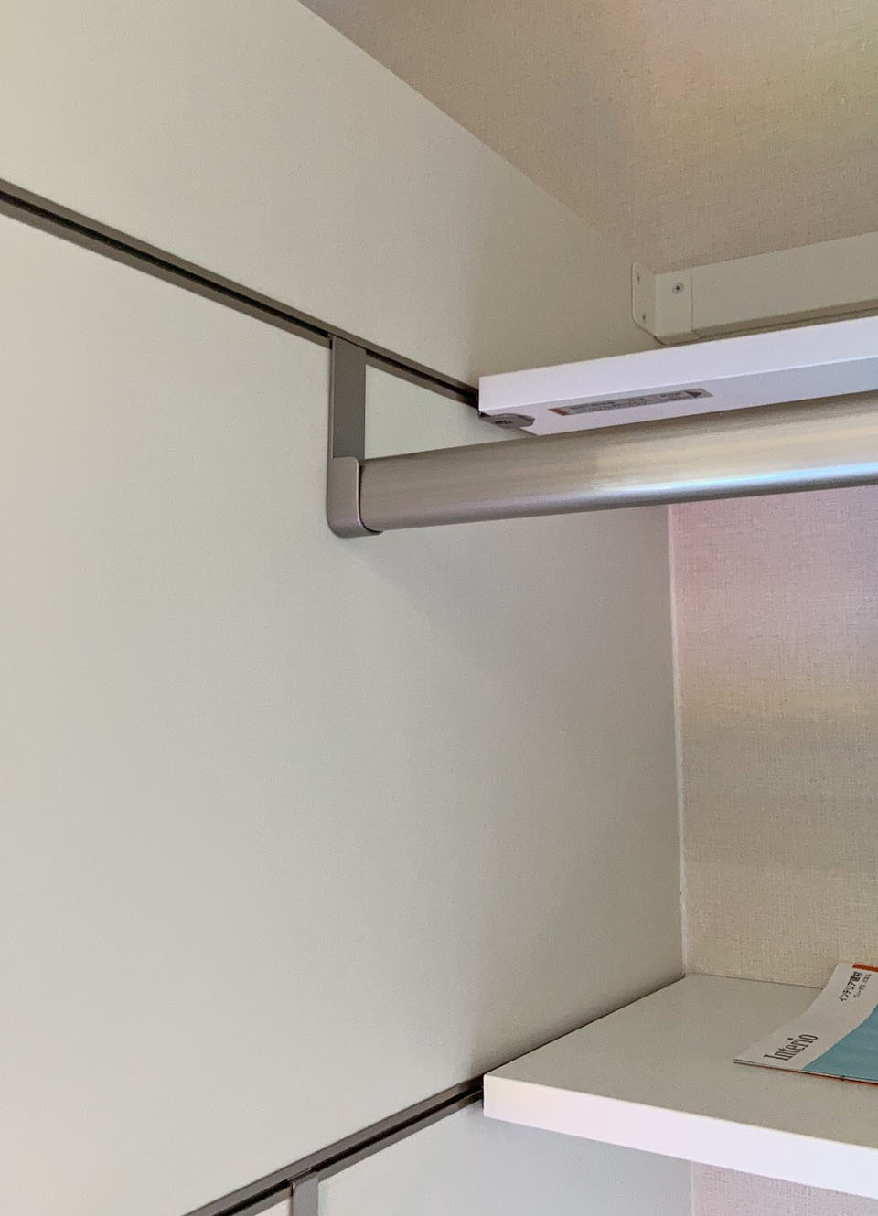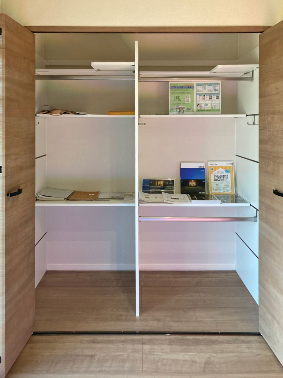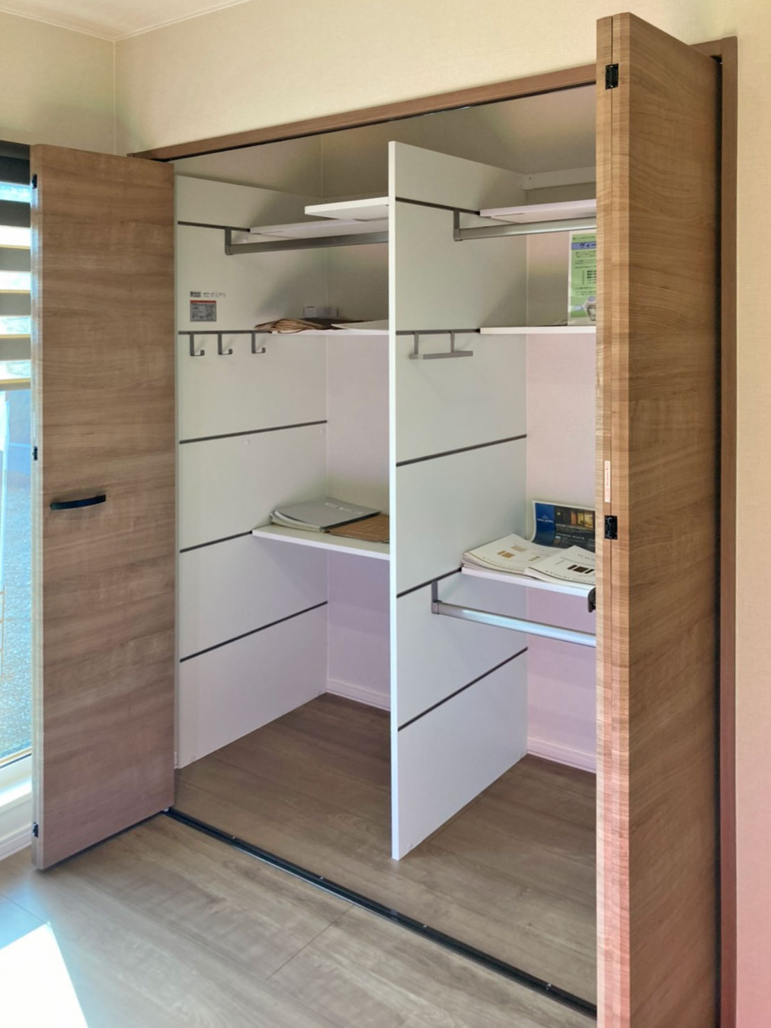 通常モデルハウスの収納は布団が入る押入タイプか、ステンレスパイプが入ったクローゼットタイプが主なのですが、こちらのモデルではちょっとこだわったものを入れております(^^)/LIXILさんのヴィータス パネルという商品です!