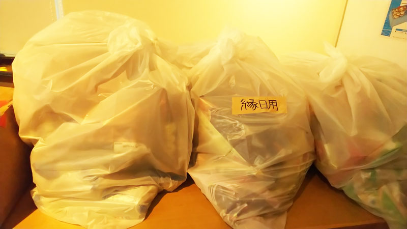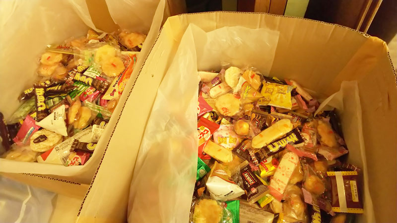 こっちの混ぜてある箱はお菓子撒き用です。右の箱は小学生未満用…赤ちゃん煎餅が入ってたり、つまようじのついたお菓子や硬いお菓子が抜かれていたり。左は大きい子用の箱。ココアシガレット(子供が良く駄菓子屋で買ってきてたばこごっことかするラムネ?です)やビッグカツなどが多めに入っていたりします。焼肉さん太郎もあるよ!