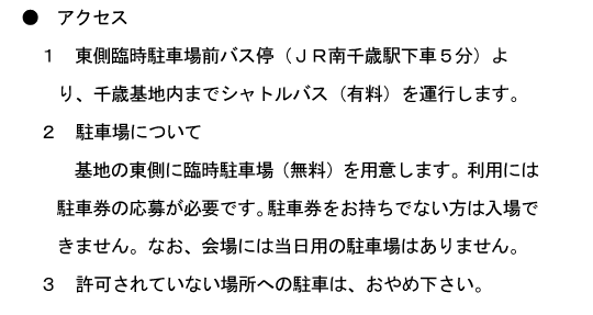 ちなみに航空祭の情報ページはこちら↓駐車場やシャトルバスの利用について書かれています。