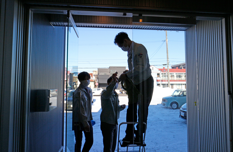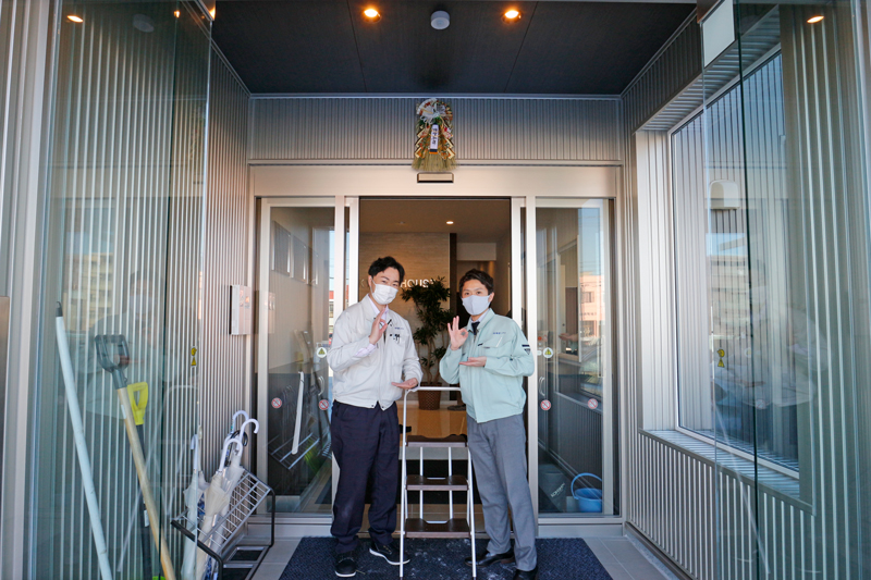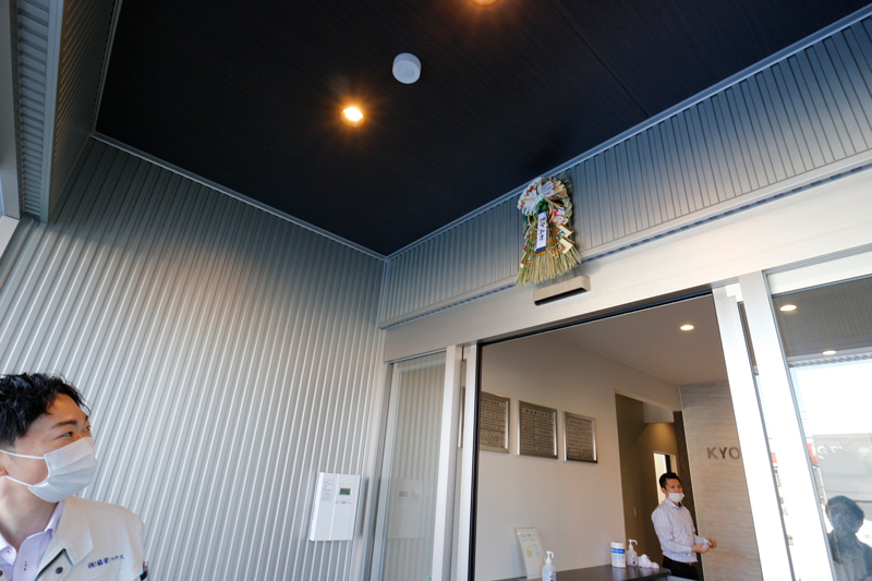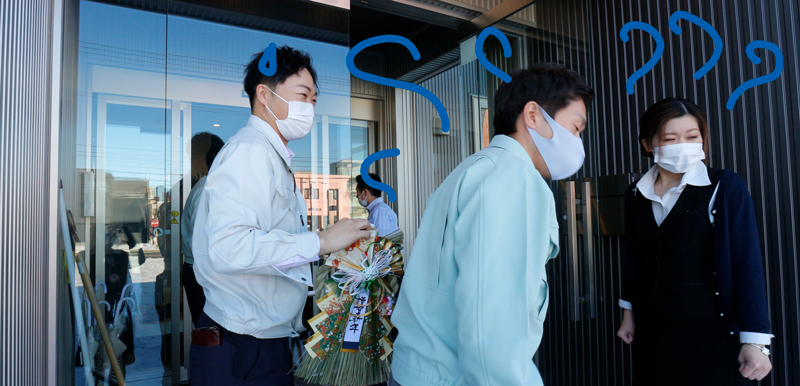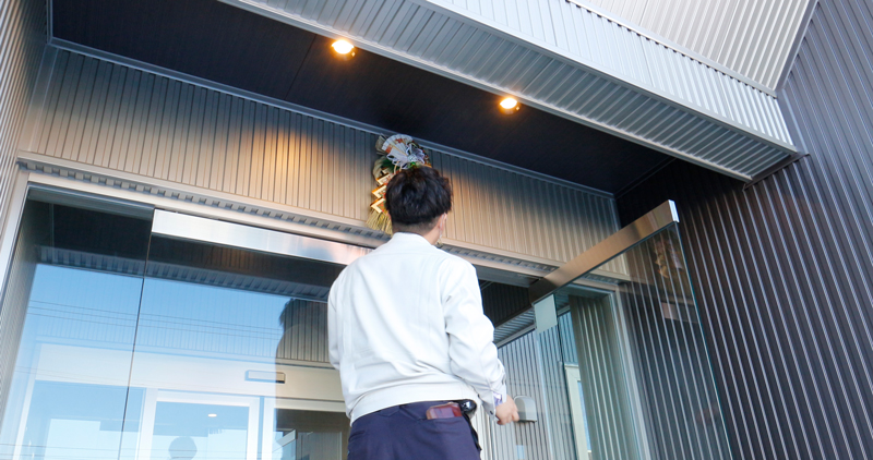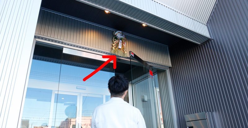 営業・板東氏。しめ飾りをつけようと脚立に上がるも身長が足りず、工事部の長谷川氏にバトンタッチ。