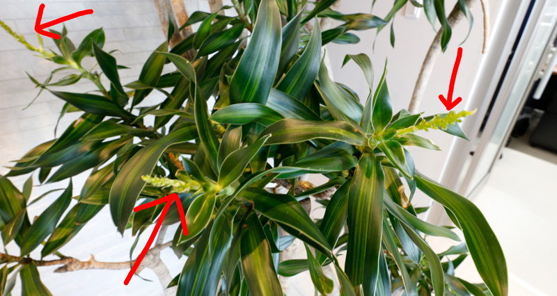気づくと玄関に飾らせていただいている観葉植物に花?が咲いていました(^^)