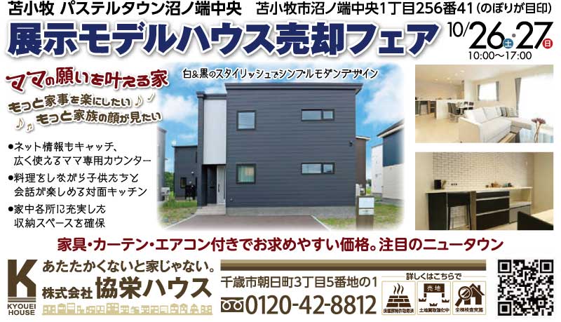 沼ノ端モデル売却フェア開催! 千歳・恵庭・札幌|モデルハウス・新築・戸建て・土地【協栄ハウス】 > 全件 > イベント > 沼ノ端モデル売却フェア開催! 10/26(土)・27(日)は、苫小牧の沼ノ端中央モデルへ! ローンのご相談等、普段なかなか聞けないこともご相談ください。 家を建てたいけれど土地も高いし…。 なんて中古住宅のチラシを眺めている週末。モデルハウスや建売も視野に入れてみるのはいかがですか?? ご来場いただいたお客様には粗品を差し上げます。(※普段は使わないけれど、いざという時あると便利なミニミニドライバーセットです) « 前のページ 一覧に戻る 次のページ » アーカイブ 年を選択 2025 (11) 2024 (81) 2023 (87) 2022 (119) 2021 (165) 2020 (154) 2019 (166) 2018 (246) 2017 (206) 2016 (47) 2015 (23) 2014 (5) カテゴリー カテゴリを選択 全件 お知らせ イベント その他