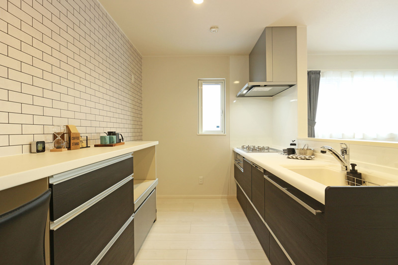 こちらのキッチン、背面収納は引き出しのみで上部の収納がありませんが、その分ロングで出し入れがしやすいタイプとなっております。(一般的なコの字タイプや二の字タイプですと小柄な奥様は上の方の棚は届かない…なんてことがよくあるんですよね…)上の方が開けていて明るいというのも好評でした。