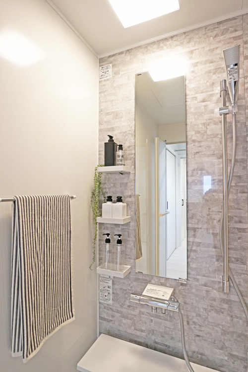 オマケ:お風呂のほっカラリ床で有名なTOTOさん。一番人気のデザインがこちらの組み合わぜ。壁・床・浴槽がホワイトに石目っぽいアクセントパネル。白×薄いグレーなので浴室が明るく見えます。