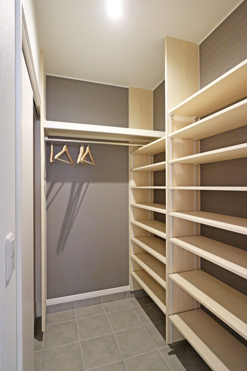 こちらはシューズクローゼット。協栄ハウスではほとんどのオーナー様が希望されます。中でもオススメなのがこの、シューズクローゼットの中にポールを入れて上着もかけられるようにしたスタイル。雨や雪で濡れたコートは室内で干したくありませんからね…。