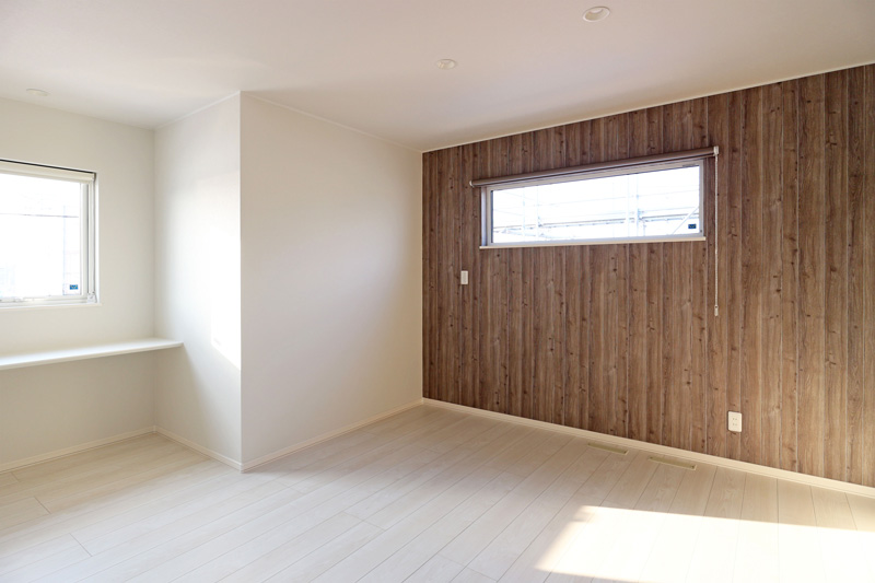 こちらは寝室。ベッドスペースの隣(?)に造作のカウンターがあります。ご主人のPCスペースとして使ってみたり、鏡を置いて奥様のメイクスペースなどにしても良さそうです。
