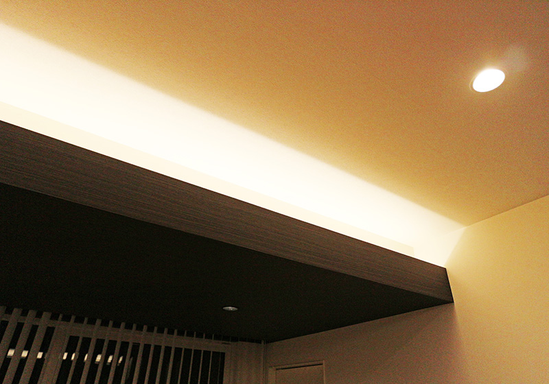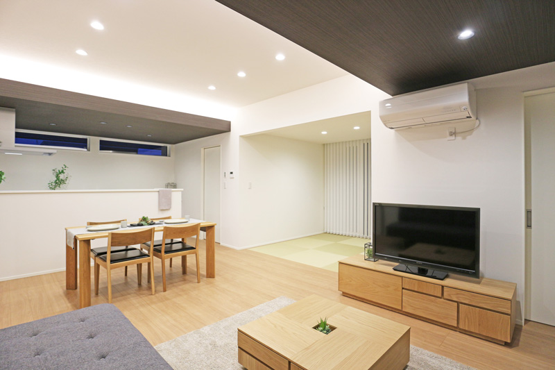 今回のモデルは落ち着きのある佇まい。ナチュラル系インテリアにも、ジャパニーズモダンスタイルにもよく馴染みます。ポイントはリビングの両端から照らす間接照明。やわらかな灯りが心身ともにリラックスさせてくれます。