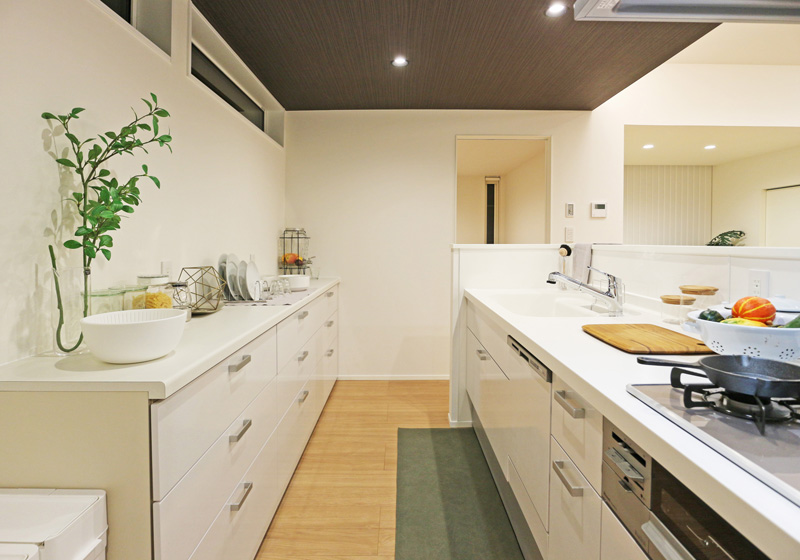キッチンはシンプルに使いやすく。空間を圧迫しないよう、食器は下の引き出しに収納します。カウンターも一般的なサイズより90㎝長い余裕のあるタイプ。レンジに炊飯器、ミキサーにコーヒーメーカー。これだけ並べてもまだ、お気に入りを追加できるのはうれしいところ。