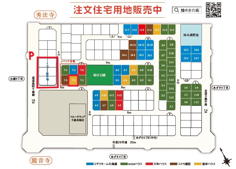 1/20-21は合同イベントのため、ツルハさん駐車場が、お客様の駐車スペースとなります。下記画像Pの位置に停めてください。モデルハウスDANは画像内黄色の枠7-2番です。