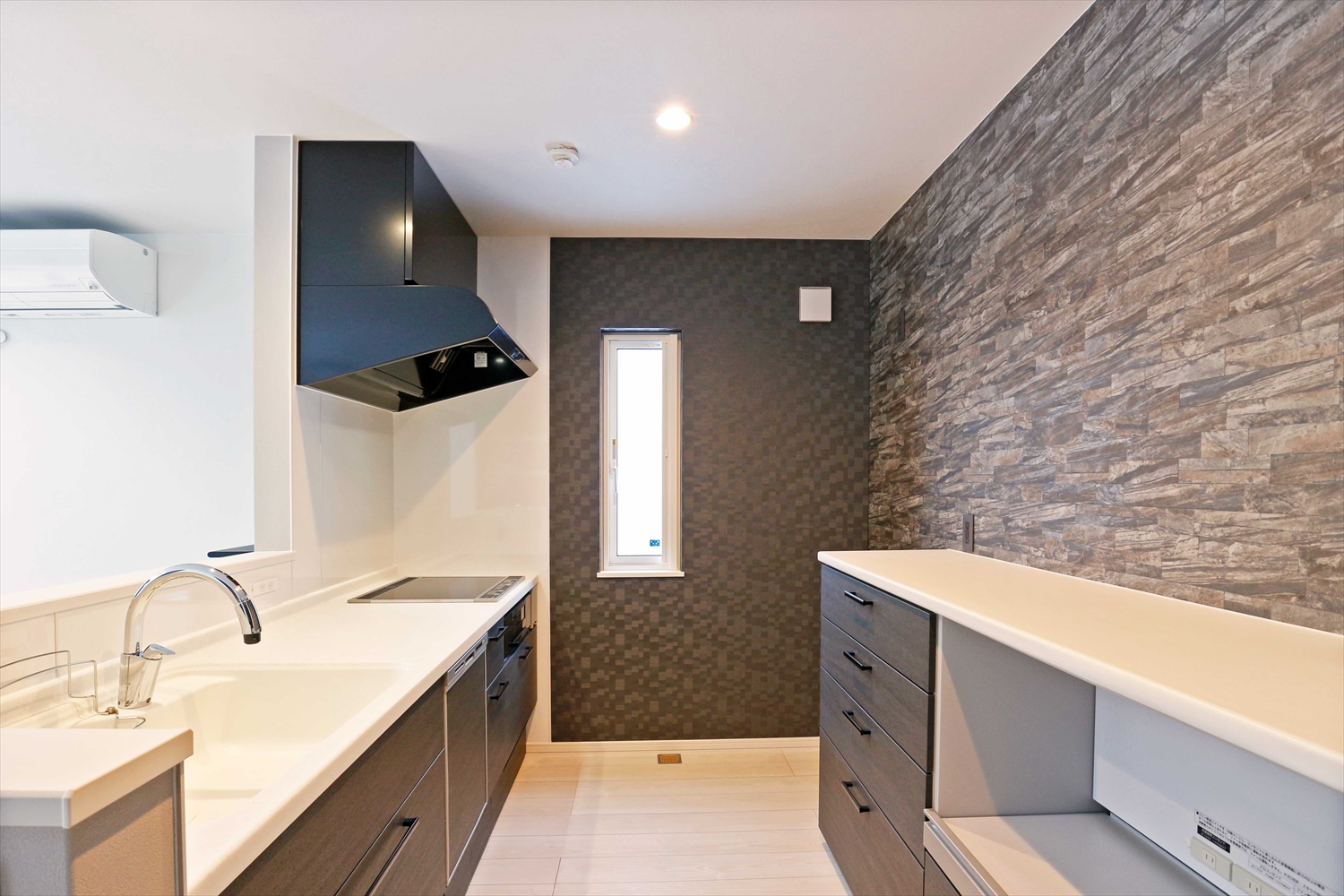 背面のクロスが扉色とよく合う、トクラスのキッチン