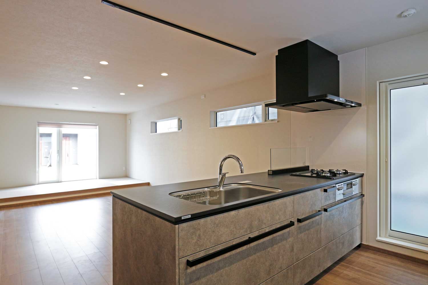 そしてクリナップの、そこにあるだけで映える高級キッチン。深みのある盤面がとても美しいです!背面収納もこだわりの形状です♪