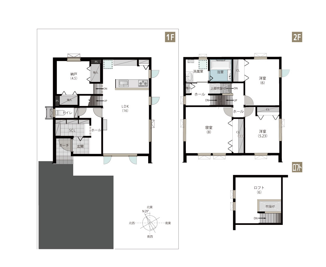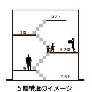 コンパクトな見た目でありながら中は意外と広く、半地下⇒一階⇒中二階⇒二階⇒ロフト、と、空間を有効活用した5層構造となります。半階ずつずらしたスキップ構造は、『秘密基地みたい!』とお子様やご主人にも好評をいただいております。