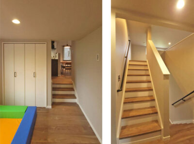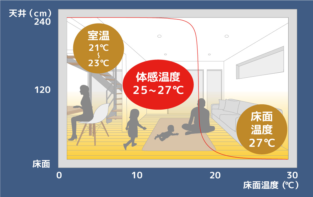 協栄ハウスの床暖は階段やキッチンの下などを除いた、ほぼ全ての床に温水を送るパイプが通っています。家中どこにいても同じ温度で過ごせるうえ、足元から温めるから、上が暑くて下は寒いという暖房の悩みから開放されます。