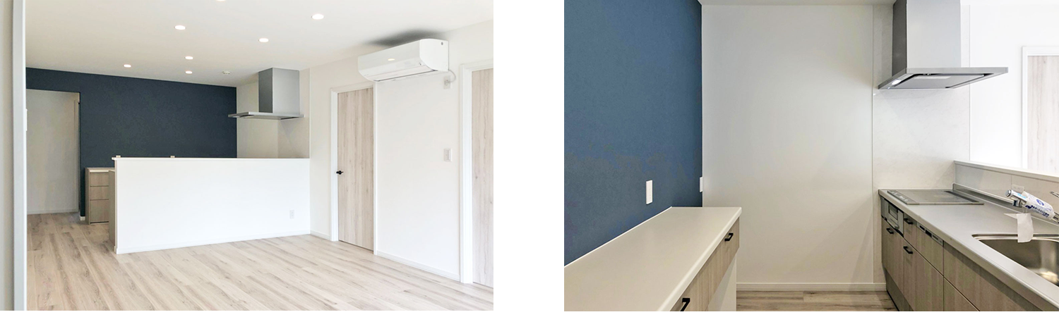 外観とお揃いの白と青のイメージ。 背面収納の上には大きな棚が設置されます。