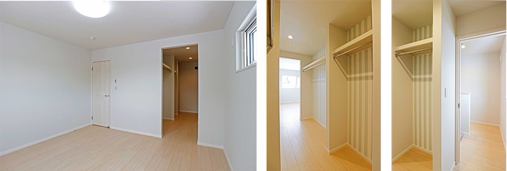 2Fの見どころはやはりウォークスルーの大型クローゼット!大きなクローゼットは物を奥にしまい込んで出すのが面倒になるなんてこともありますが、これならそんな心配もありません。下の画像のように寝室から階段前までが繋がっていて、回遊できるようになっています。どちらからも出し入れできるのは便利ですよね。ウォークインとウォークスルーで悩まれている方も多いのではないでしょうか。口コミも良いですが、実物を見るのが一番おススメですよ😄