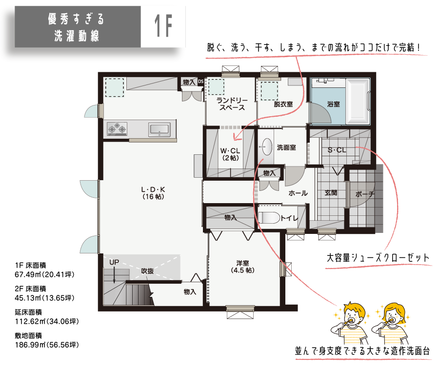 二人並んで身支度できる大きな造作洗面台に、沢山の靴が仕舞える広いシューズクローゼットなど、暮らしやすくするための工夫が沢山の家です