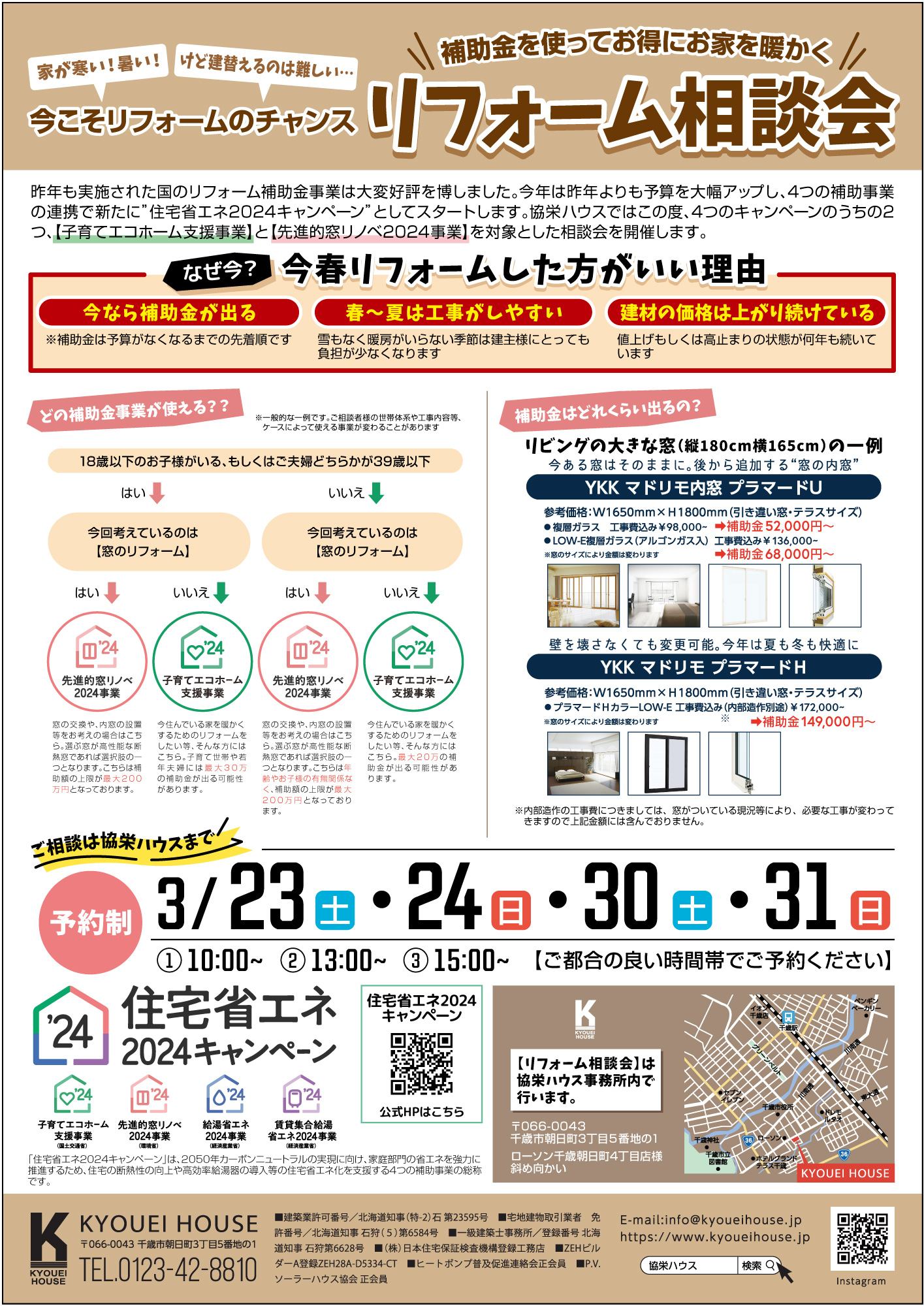 好条件がそろった今、補助金事業に乗っかるためにはどうしたらいいのか?何が対象で、何が対象外なのか。住宅省エネ2024キャンペーンのHPは難しすぎて正直一般のお客様が見てもさっぱりだと思います…。相談会でどこをどうしたいのかご希望をお聞かせください。協栄のスタッフがお見積り+補助金適用の可否などお調べいたします。まずは今週・来週の相談会のご予約をお電話でお願い致します。ご不便をおかけして申し訳ございませんが、予約枠の確認が必要なため、本イベントはWEB予約をお断りしております。