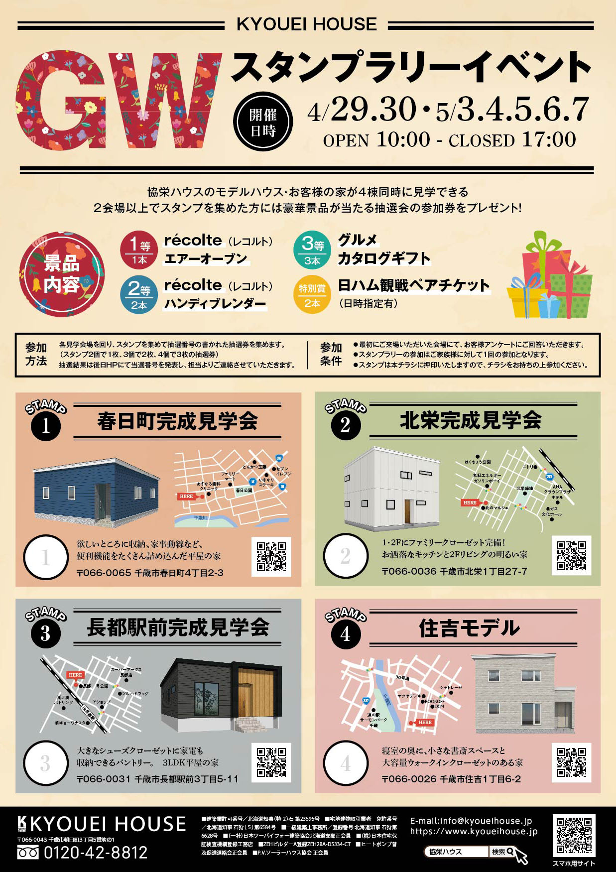 GW期間中は千歳市内で見学できるお家が、モデルを含め4棟に!マイホーム検討中の方、間取りづくりに悩んでいる方にとってはとても参考になる“お客様が建てた家”。この際全部回ってみませんか?みんな特徴が違うので4棟とも見ていただきたいところですが、2棟からでもスタンプが貰えます!せっかくですので、2棟以上回って抽選券を貰ってくださいね♪