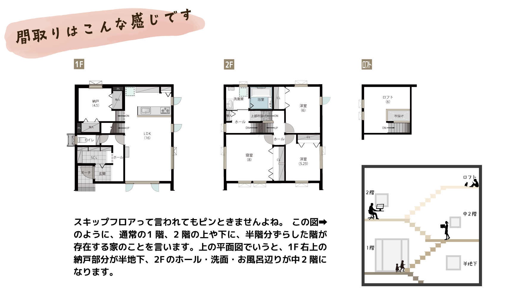 半地下、中二階、さらに上には階段で上がれる安全なロフト付き。遊び心満載な住空間は、アクティブな家族におススメです。