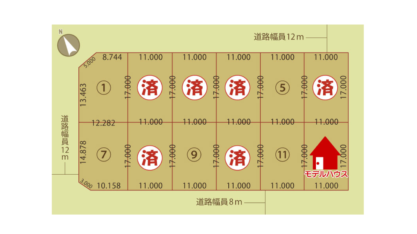 現在、5宅地分譲中。(⑫はモデルハウスです)