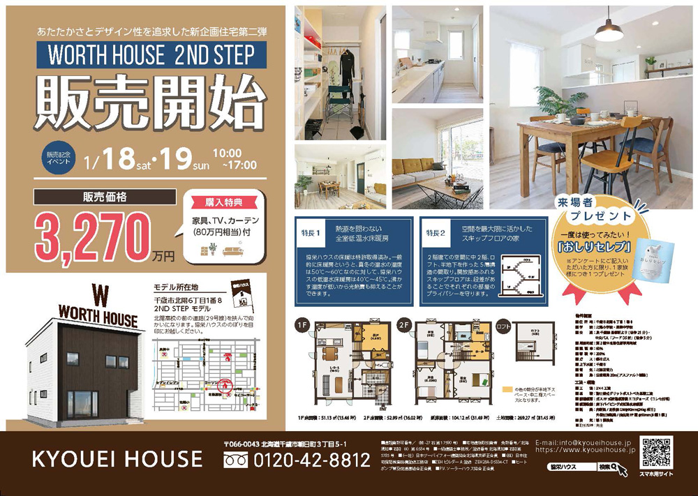 2ND STEP販売開始! 千歳・恵庭・札幌|モデルハウス・新築・戸建て・土地【協栄ハウス】 > 全件 > イベント > 2ND STEP販売開始! モデルハウスの紹介ページには金額が出ているので気づいた方もいらっしゃるかもしれませんが… 千歳市北陽のスキップフロアのモデルがいよいよ販売開始となりました! ↓こちらは今週のちゃんと千歳版に折り込みになったチラシです。 ダイニングテーブルセットやソファ、TVにテレビ台、カーテン等がついてこの金額です!ご検討下さい(^^) « 前のページ 一覧に戻る 次のページ » アーカイブ 年を選択 2025 (11) 2024 (81) 2023 (87) 2022 (119) 2021 (165) 2020 (154) 2019 (166) 2018 (246) 2017 (206) 2016 (47) 2015 (23) 2014 (5) カテゴリー カテゴリを選択 全件 お知らせ イベント その他