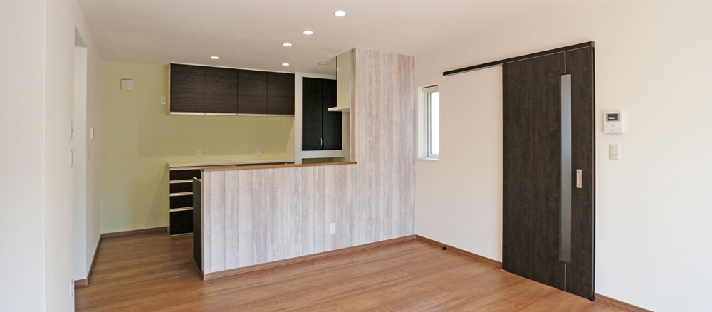 こちらは玄関部分の外壁の貼り分けが特徴的なお家です。キッチンの横に可愛らしいクロスが貼られたパントリーがありますよ!冬場の電気代を節約できるコレモも魅力的です。(5/9までの毎週土日祝日、ロングラン公開です)
