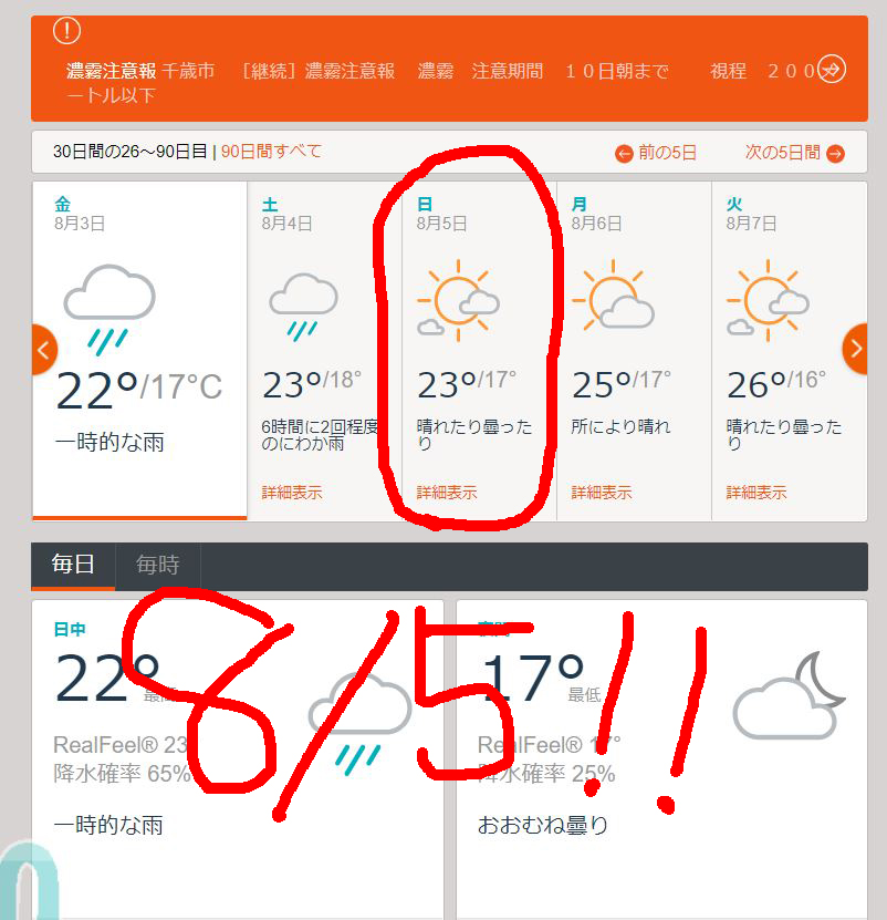 さて、やはり気になるのは天気なのですが、accuweatherというサイトではかなり先の天気を公開しています。気になって8/5の千歳の天気を調べてみたところ、こんな結果が出ました。↓ ↓ ↓