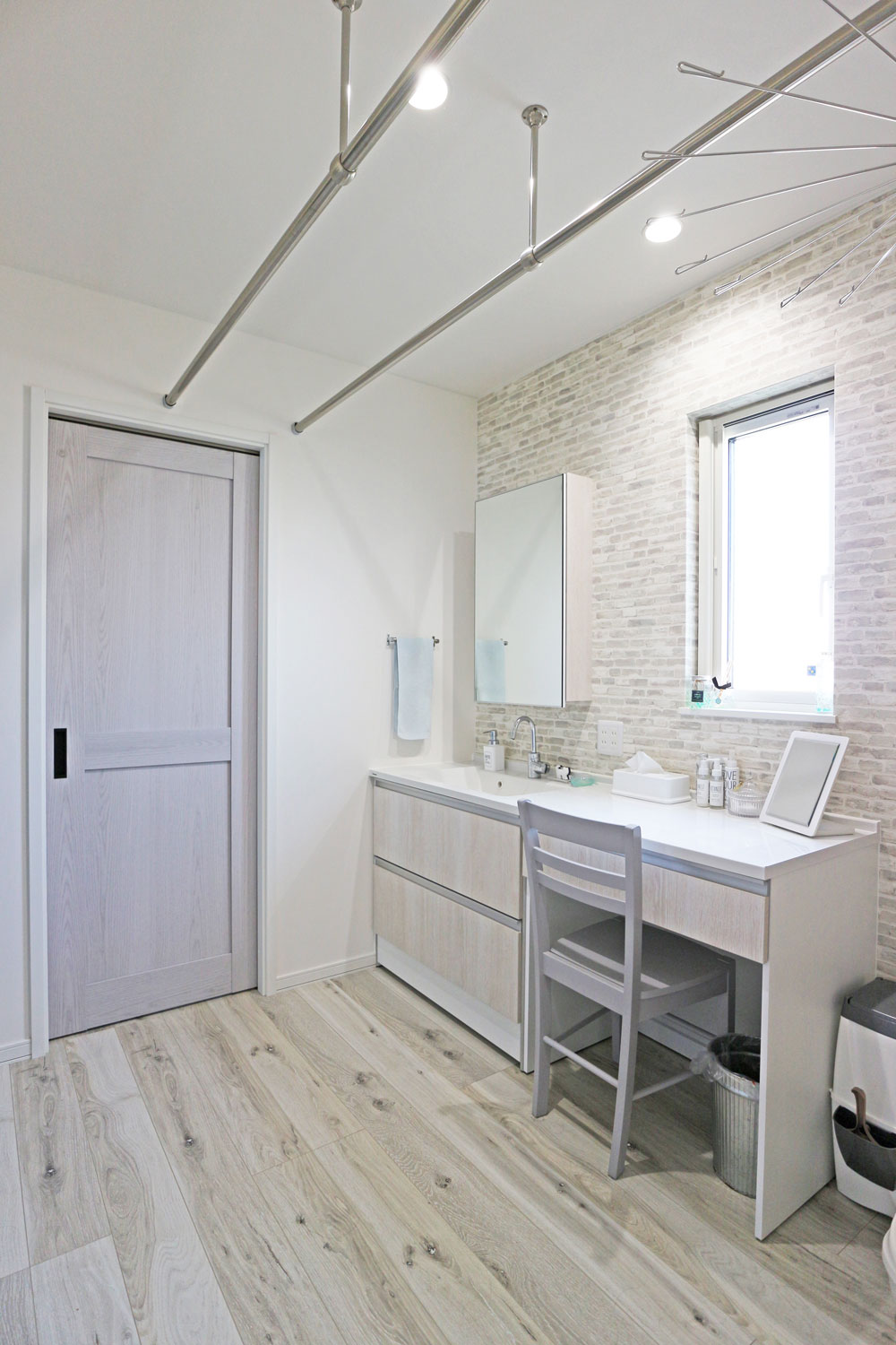 着替え以外の身支度を全部ここでできるよう、ロングタイプの洗面台に化粧品もすべて収納