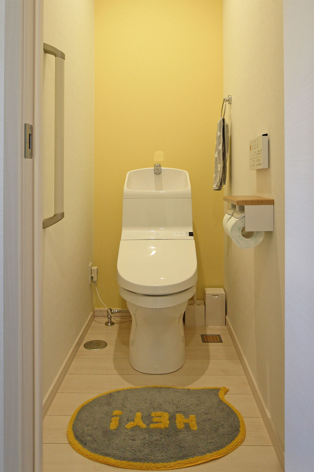 黄色いアクセントクロスが明るいトイレ。マットの『HEY!』がいい味出してます
