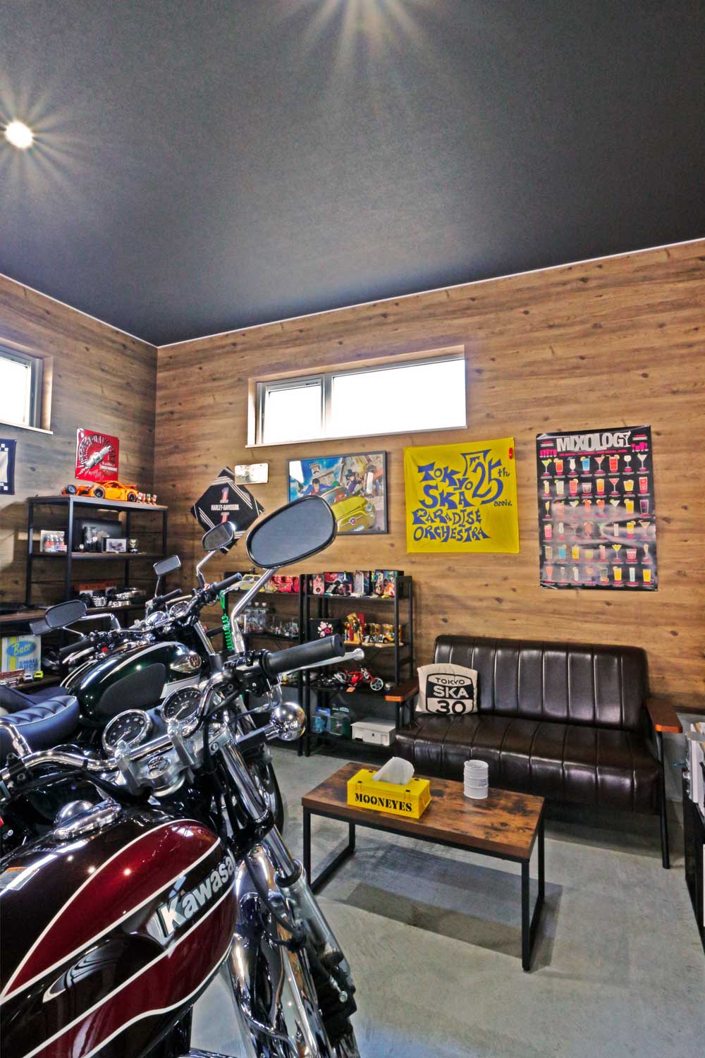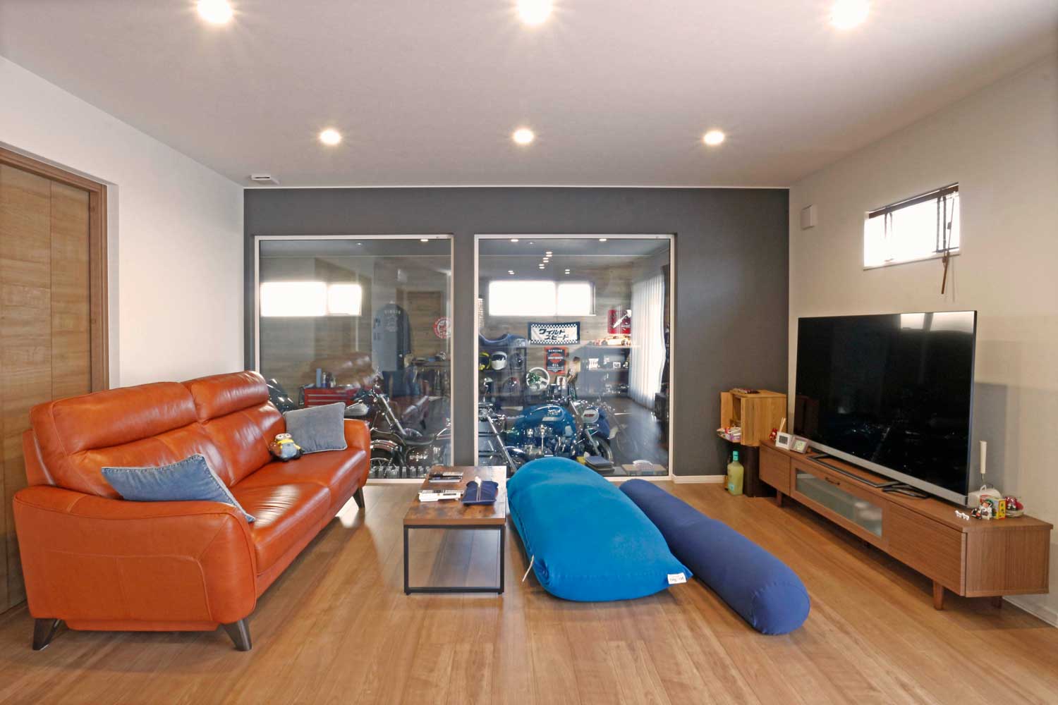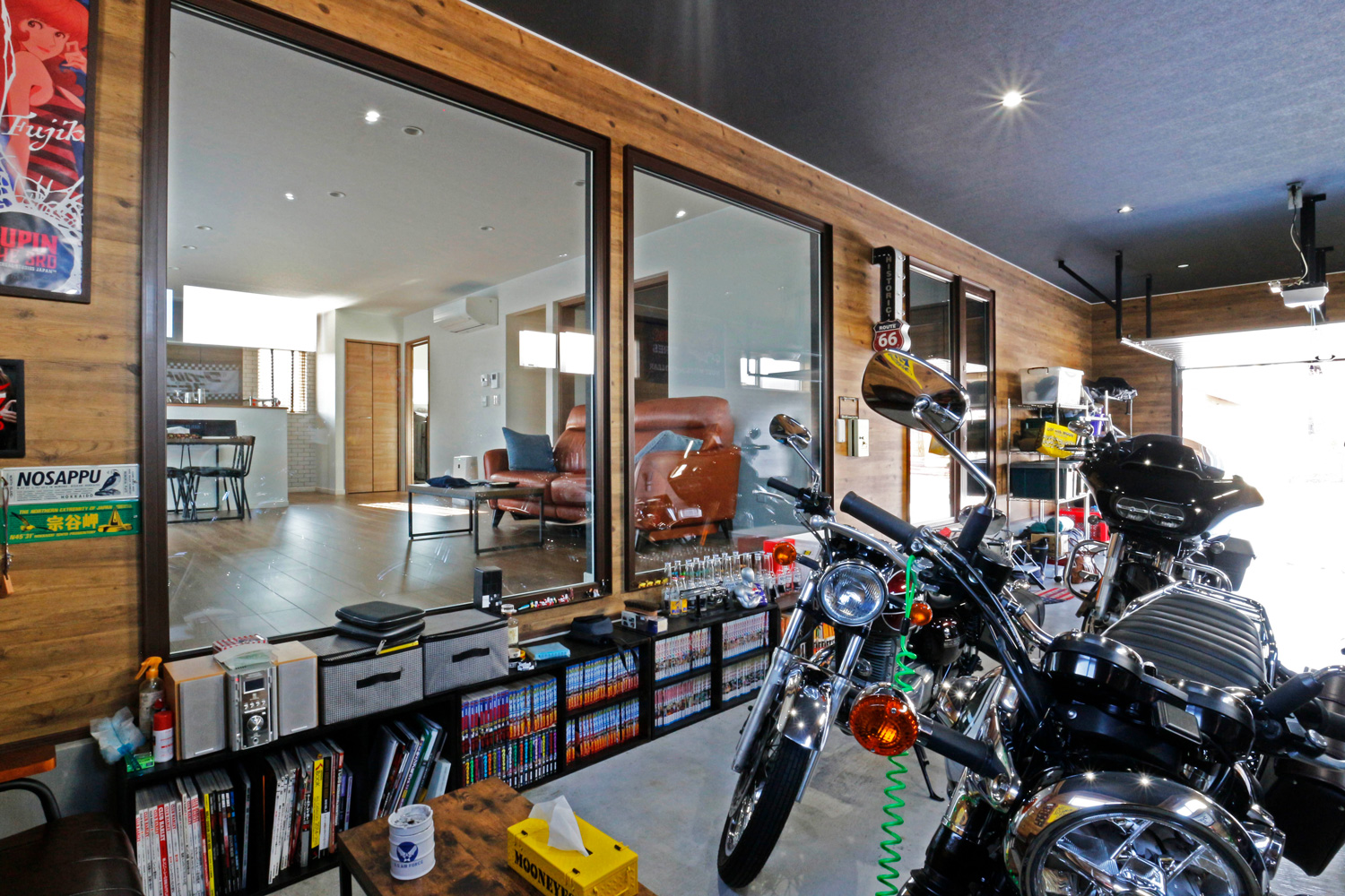 S様ご夫婦の希望は当初から【バイクを眺めながらお酒が飲める家】でした。その希望がしっかり叶ったお家は、リビング全体からガレージが見える家