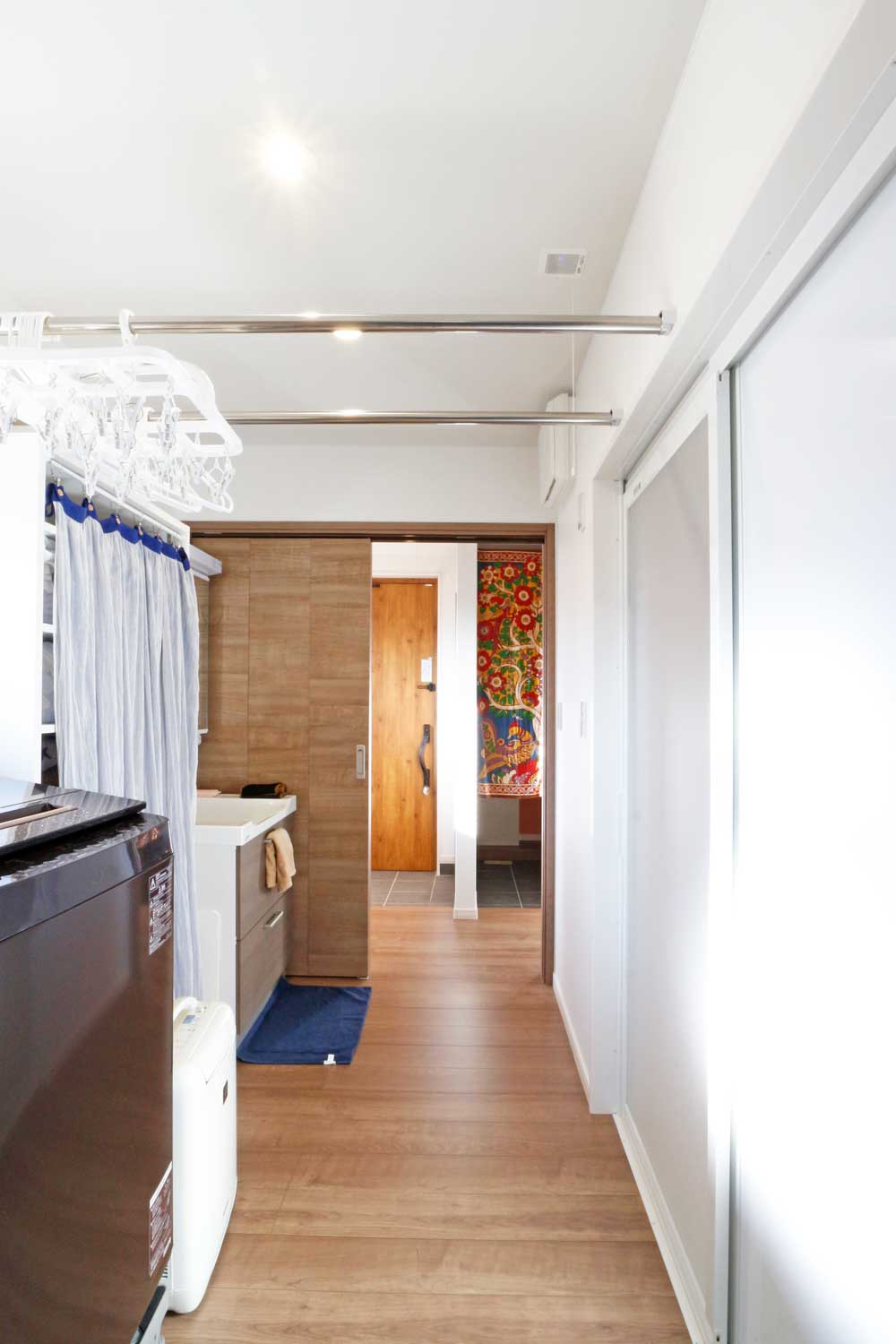 玄関から入ってすぐに手を洗える間取り。右側の引き戸はバスルームになっています