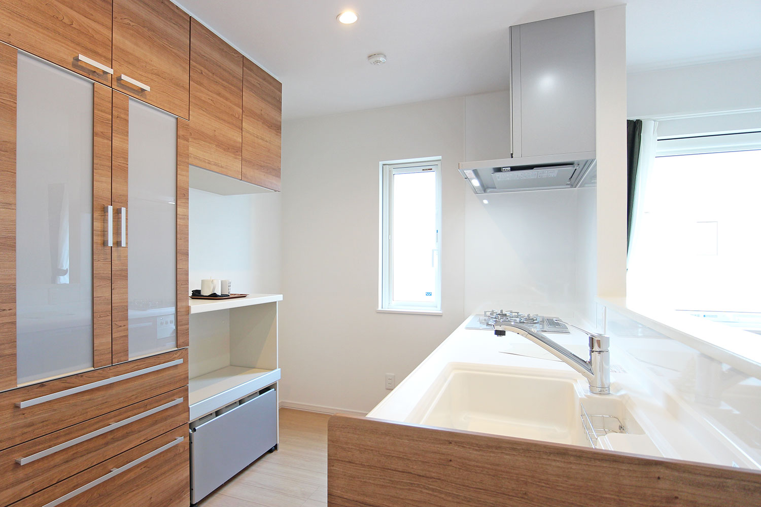 人気の対面キッチン。シンクと食器棚は色やデザインをそろえて統一感を