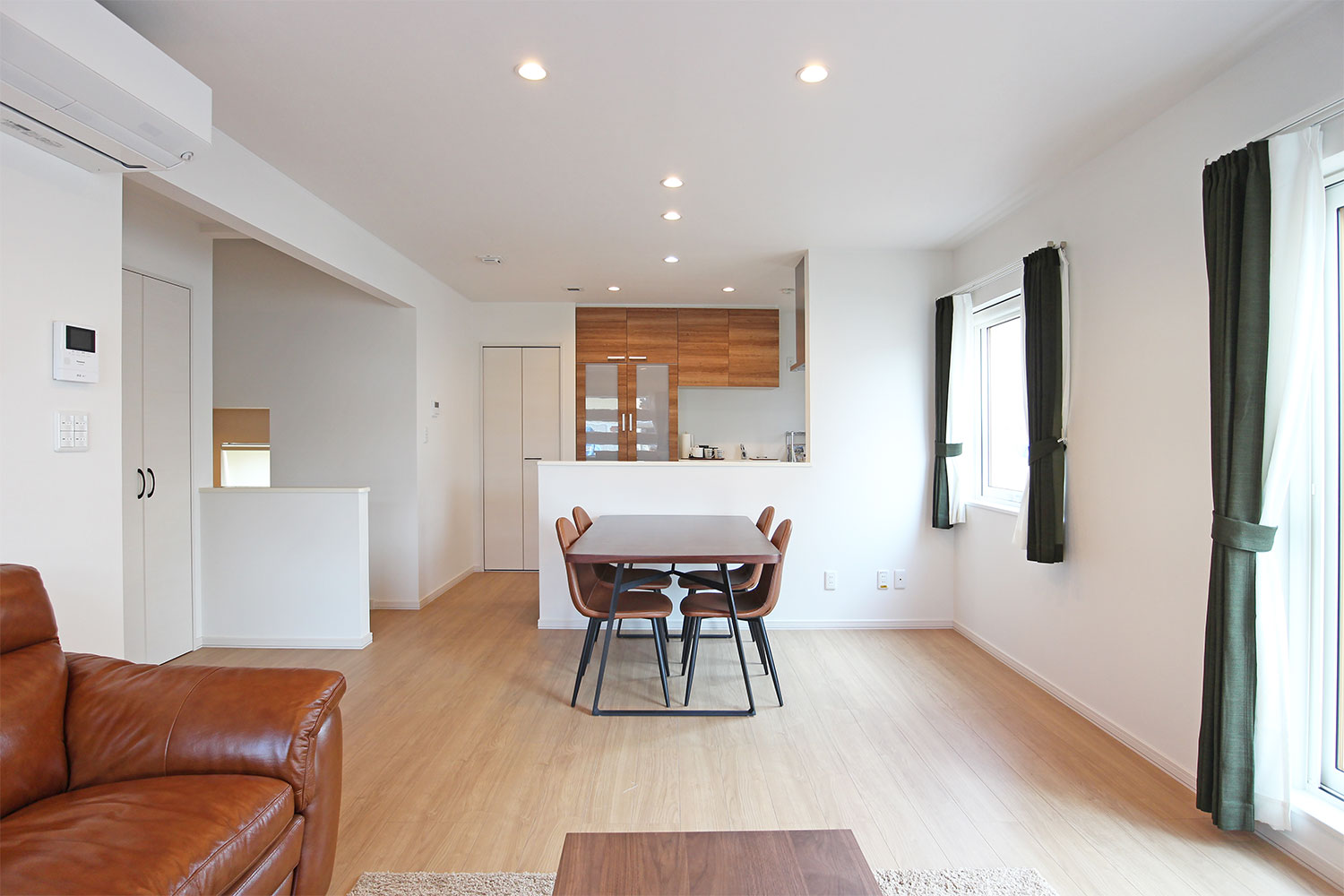12帖のLDと5帖のキッチン。ダイニングセットとリビングにソファセットを置いても広々