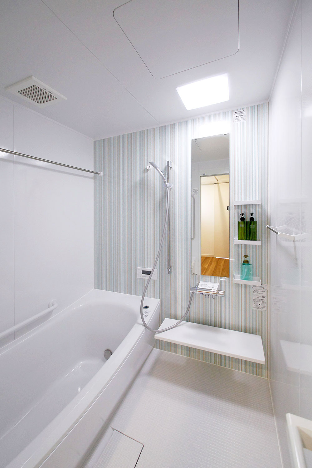 白いバスタブ&アクセントにマルチカラーの明るいバスルーム