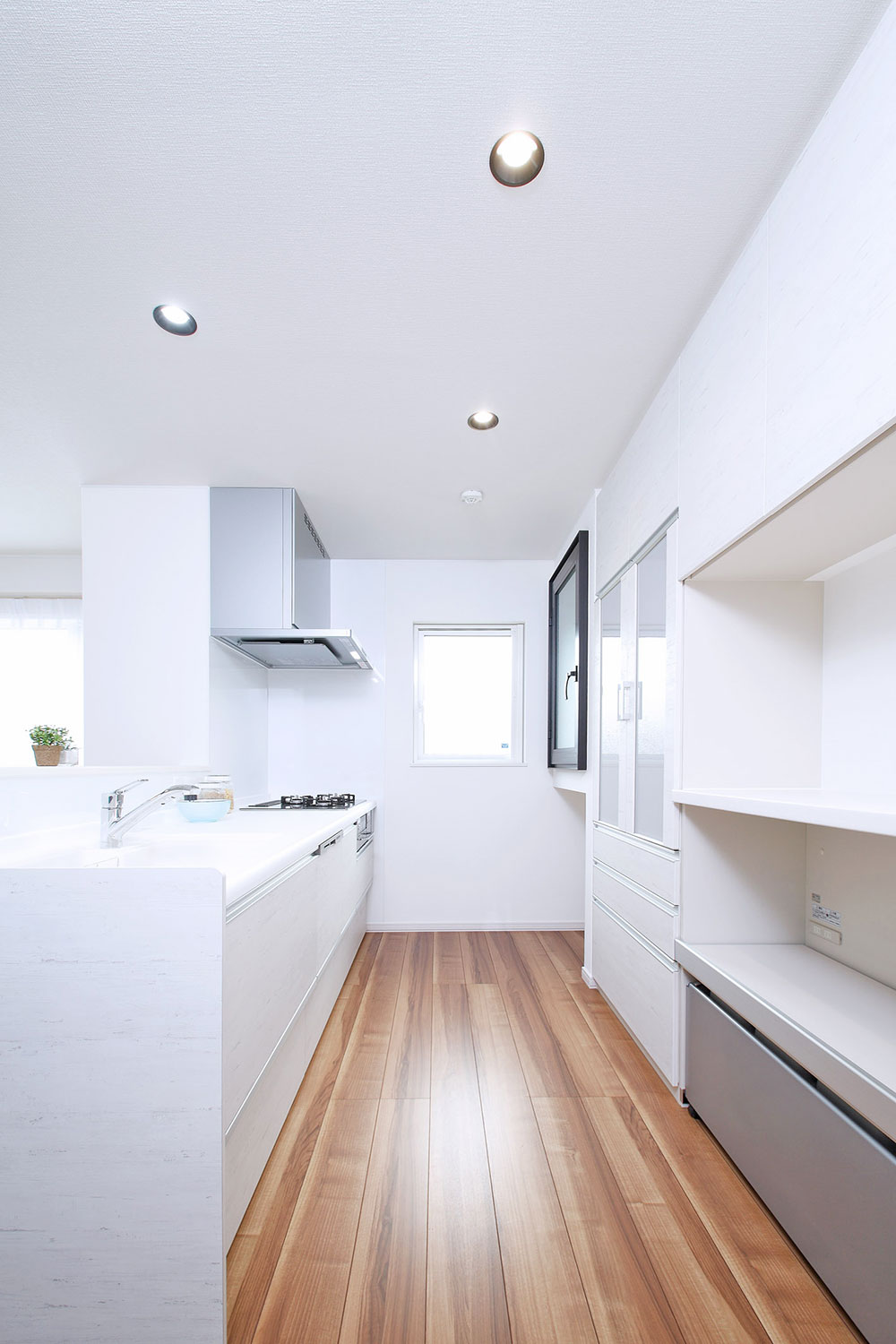 真っ白なキッチンの奥には食品庫。外気を取り入れる天然の冷蔵庫はとってもエコなシステム
