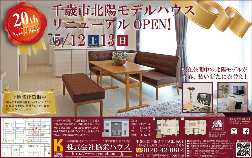 せっかくだから、ちゃんと“ちゃんと”の誌面広告で(シャレじゃないですよっ(´Д⊂ヽ)告知しようということで。今週の土日はリニューアルOPENイベントです!いつもよりスタッフを多めに回しております!?この際だから、協栄の床暖のこと・家のこと・お金のこと、スタッフを捕まえて質問攻めしちゃってください。